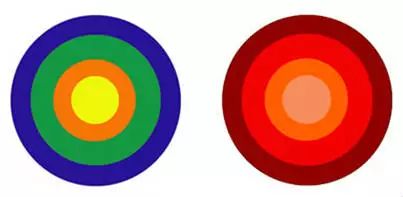 實際上這是視錯覺的一種現象,一般暖色、純色、高明度色、強烈對比色、大面積色、集中色等有前進感覺,相反,冷色、濁色、低明度色、弱對比色、小面積色、分散色等有后退感覺。
