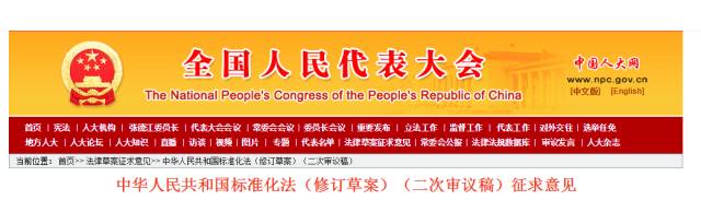 8月28日-9月1日召開的第十二屆全國人大常委會第二十九次會議對標準化法(修訂草案二次審議稿)進行了審議。9月4日,中國人大網全文公開了標準化法(修訂草案二次審議稿),向社會公開征求意見。